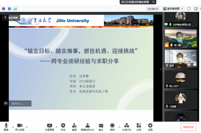2019级硕士研究生沈梦蓉同学作为非本校非传统地质专业的一名跨考研究生,通过自身三年的努力学习,成功签约了中海油深圳公司。她从跨专业就业的角度,以《锚定目标、踏实做事、抓住机遇、迎接挑战——跨专业读研经验与求职分享》为题,围绕跨专业读研经历、“升学or就业?”及“笔试and面试”这三方面与大家分享了自己的学习、科研及求职经验。她表示,跨专业的学生更要注重学科研究基础思维的建立,要积极参与科研项目,注重团队合作,主动与团队中老师和师兄师姐请教交流,提高自己的专业素养,为对口就业做好准备。在面对未来选择的迷茫时,沈梦蓉建议大家考虑未来人生规划、当前阶段性目标以及长远的人生方向,充分考虑个人能力,开拓就业视野,最终实现成功就业。