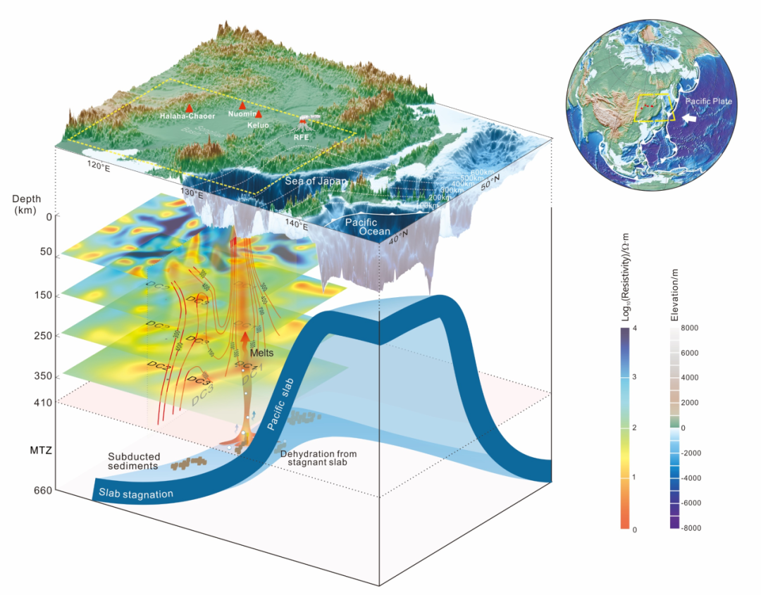 许文良教授和其引领的“地球深部动力学创新团队”成员王枫教授等,选择以东北亚新生代高镁安山岩为代表的板内火山岩作为研究对象(图1),通过地质学、地球化学、地球物理、高压物理等多学科交叉综合研究,证实了东北亚地区地幔过渡带中存在板块俯冲作用运移的地表水,并通过板内火山作用返回到地表,从而实现地球浅部圈层和深部圈层间的水循环,本项研究同时还估算了地球内部与表层水的交换通量。具体成果如下: