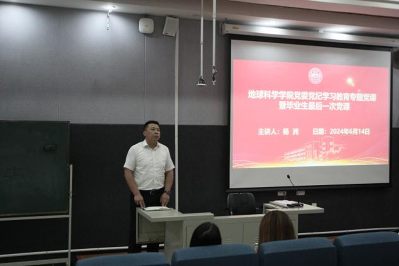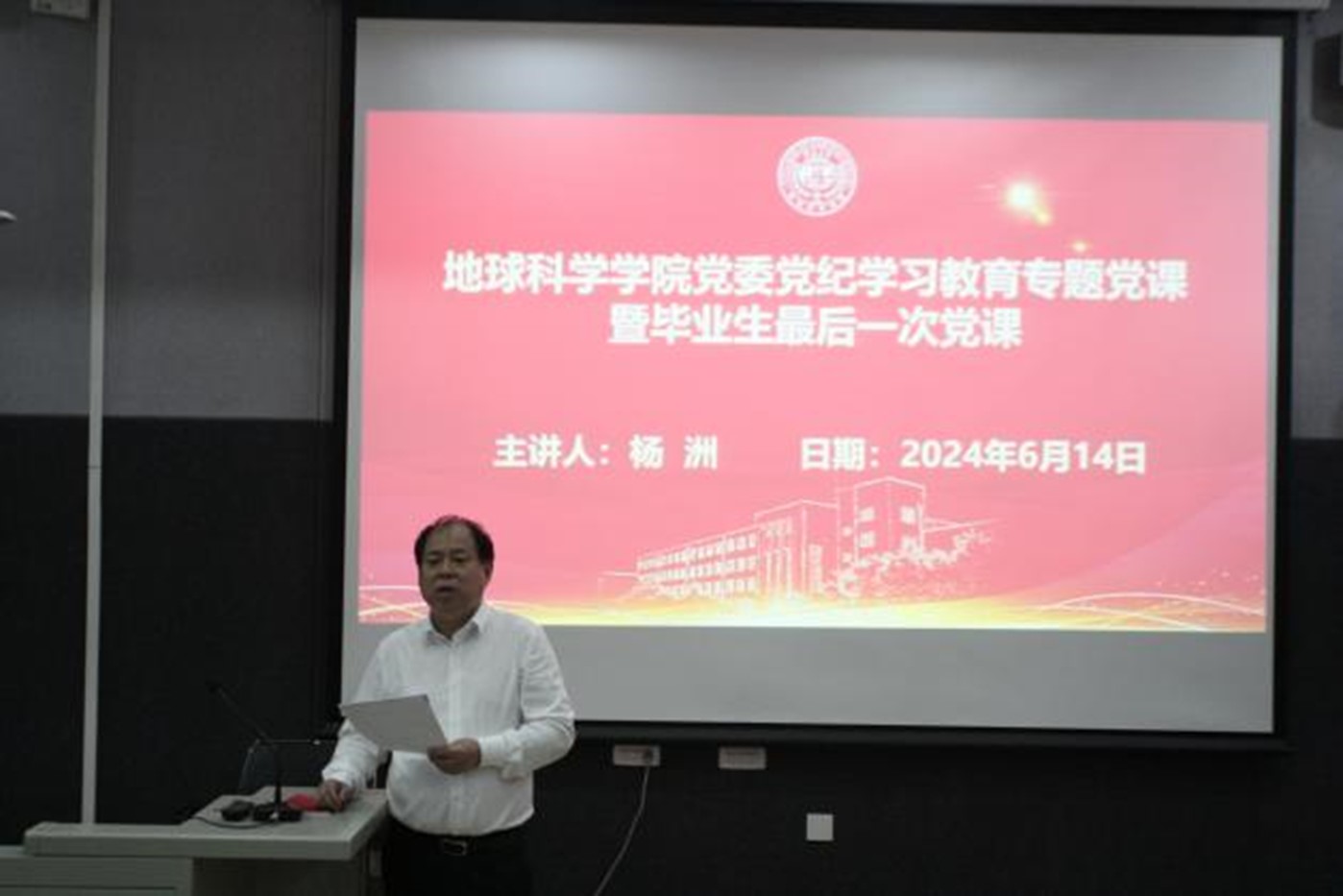 为增强毕业生党员的党性修养和担当意识,引导毕业生加强学纪、知纪、明纪、守纪的“底线思维”,推进党纪学习教育走深走实,6月14日下午,学院党委于鸽子楼125教室举办党委党纪学习教育专题党课暨毕业生最后一次党课。本次党课由党委书记杨洲主讲,党委副书记李阳、辅导员纪核鑫和赵晶出席,学院2024届毕业生党员参加活动。
