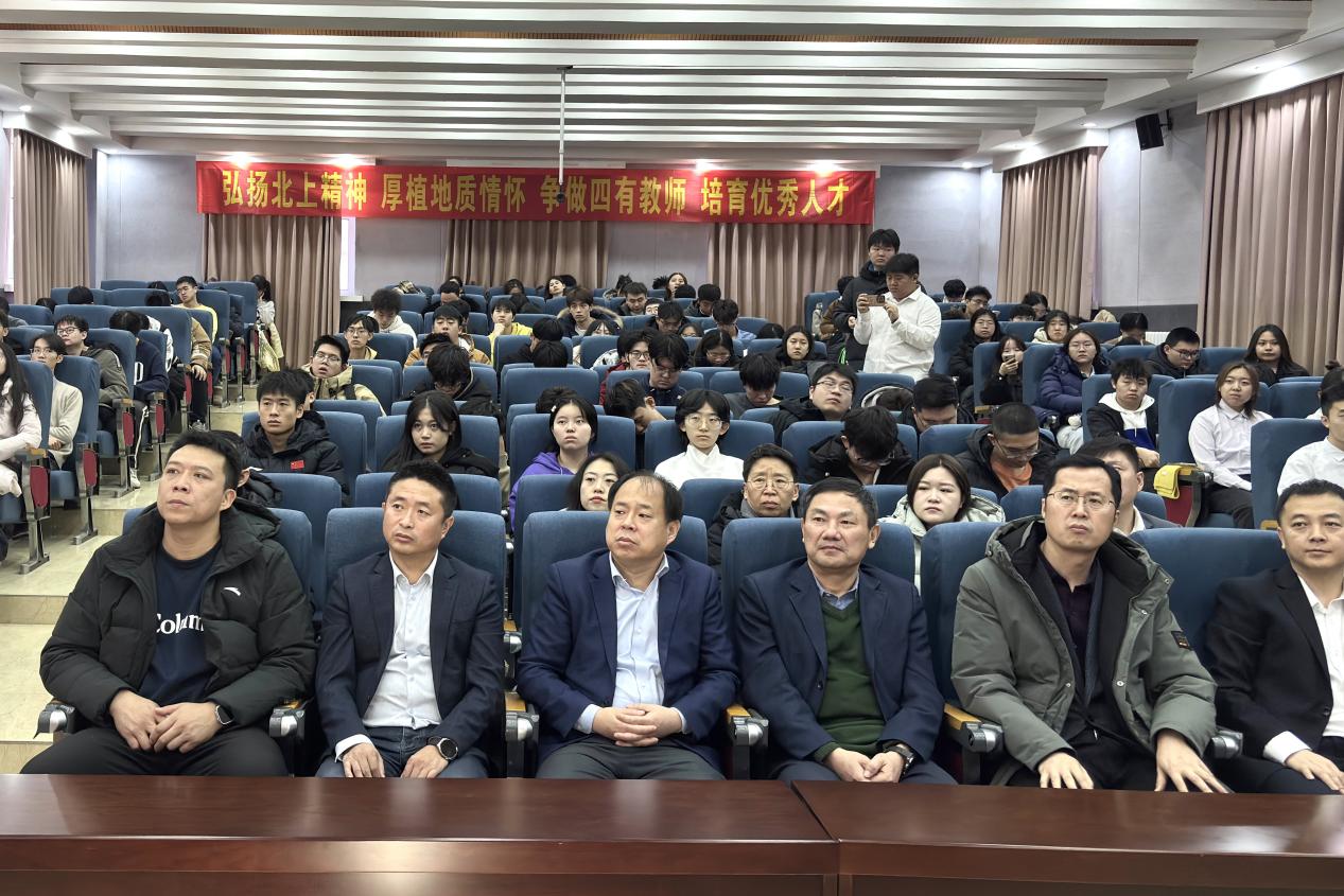 李功宇老师深情讲述了李四光、张秋生、黄大年等三代地学前辈的事迹,李四光“努力向学,蔚为国用”的奉献之志、张秋生作为“新中国第一代地质学家”的伟大师魂、黄大年“心有大我,至诚报国”的理想信念,深深感染着在场师生,彰显了地学精神的代代传承。