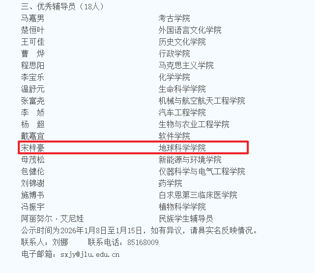 2024级辅导员宋梓豪深耕地学思政,挖掘学科红色基因,创新“数智”育人,首创“小G学长”AI辅导员助理及专业兴趣测试体系;以技术+温情引领学生成长成才,获吉林省第十届就业指导课程教学大赛一等奖,获评“优秀辅导员”荣誉称号。