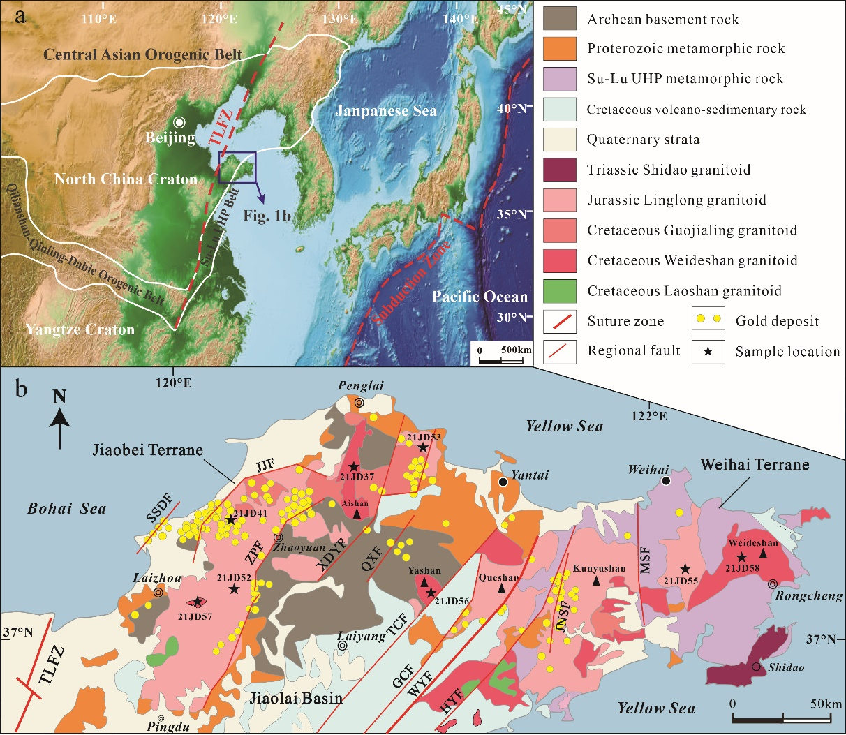 周建波教授科研团队联合山东省地矿局第六地质大队丁正江研究员科研团队研究成果。胶东半岛位于华北克拉通东南缘,是中国最大的黄金产区。晚中生代古太平洋板块俯冲作用引发了华北克拉通大规模的壳幔相互作用及爆发式成矿事件,但古太平洋俯冲—华北克拉通破坏与岩浆作用、成矿作用的耦合关系尚不清楚。有鉴于此,研究团队对胶东半岛广泛分布的岩浆岩展开系统调查,选取广泛出露的晚侏罗世玲珑期岩浆岩和早白垩世伟德山期岩浆岩样品系统开展锆石U-Pb及原位Hf同位素,全岩主微量和Sr-Nd-Pb同位素分析测试,结合大量已有年代学和地球化学资料,以深化认识胶东半岛大规模岩浆活动时间、成因和地球动力学背景及与金成矿关系,提出了胶东金矿为“造山带叠合型金矿”的新认识。