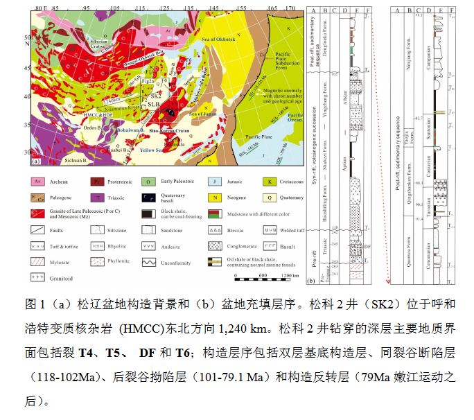 松辽盆地面积26万km2,地处我国东北。它不仅是东北亚地区规模最大、油气最富集的盆地,同时也是全球白垩纪地层记录最齐全的巨型沉积盆地。它被誉为是新中国油气工业的摇篮,在世界石油地质研究中占据独特的重要地位。松辽盆地油气地质研究已经取得了举世瞩目的成就,成为过去60多年该盆地中浅层油气勘探开发的理论支撑。然而,由于埋深大、难以获取有力的直接地质记录,因此大大增加了埋深五千米以下的深层/超深层盆地属性的探索难度;这使得人们对松辽盆地初始裂陷的形成过程迄今还缺乏必要的认知(图1)。