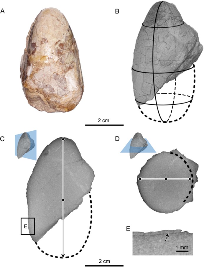 此次发现的薄外壳吉林蛋化石(标本编号DERC BD-0201)保存约70%蛋体,其独有的形态与结构特征,使其与已知蛋化石类群存在明显区分,成为确立新属新种的核心依据。该蛋体呈梨形,整体小巧且不对称,长约52 mm、宽约29 mm,经鸟类蛋质量公式估算体重约24 g;蛋壳厚度仅0.15-0.19 mm,由乳突层、鳞片层和外层构成三层结构,厚度比例为1:1.9:0.5,鳞片层为最主要组成部分;蛋壳表面光滑无任何纹饰,孔隙呈圆形、直径10-25 μm,笔直无分支且延伸至蛋壳表面,这些特征组合为该类群独有。