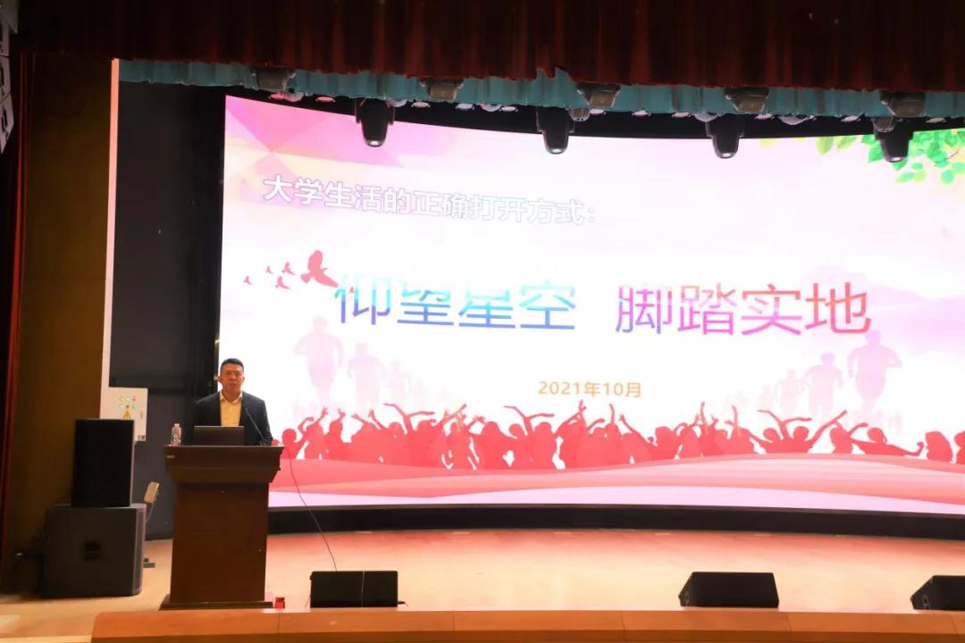 于经信教学楼新闻与传播演播厅举行“仰望星空,脚踏实地”新生第一堂思政课。院党委副书记兼副院长李阳为2021级全体新生授课。