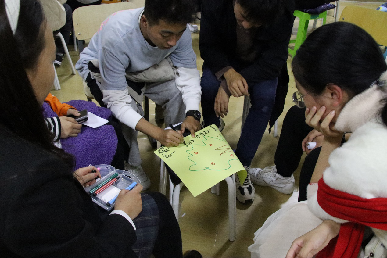 总结阶段进行了“快乐传递”游戏,和“快乐传递”。 同学们写下了自己心目中团队成员的角色,同时也明晰自己在团队成员心目中的角色和价值,在交流协作中,绘制出属于自己的“团体树”。