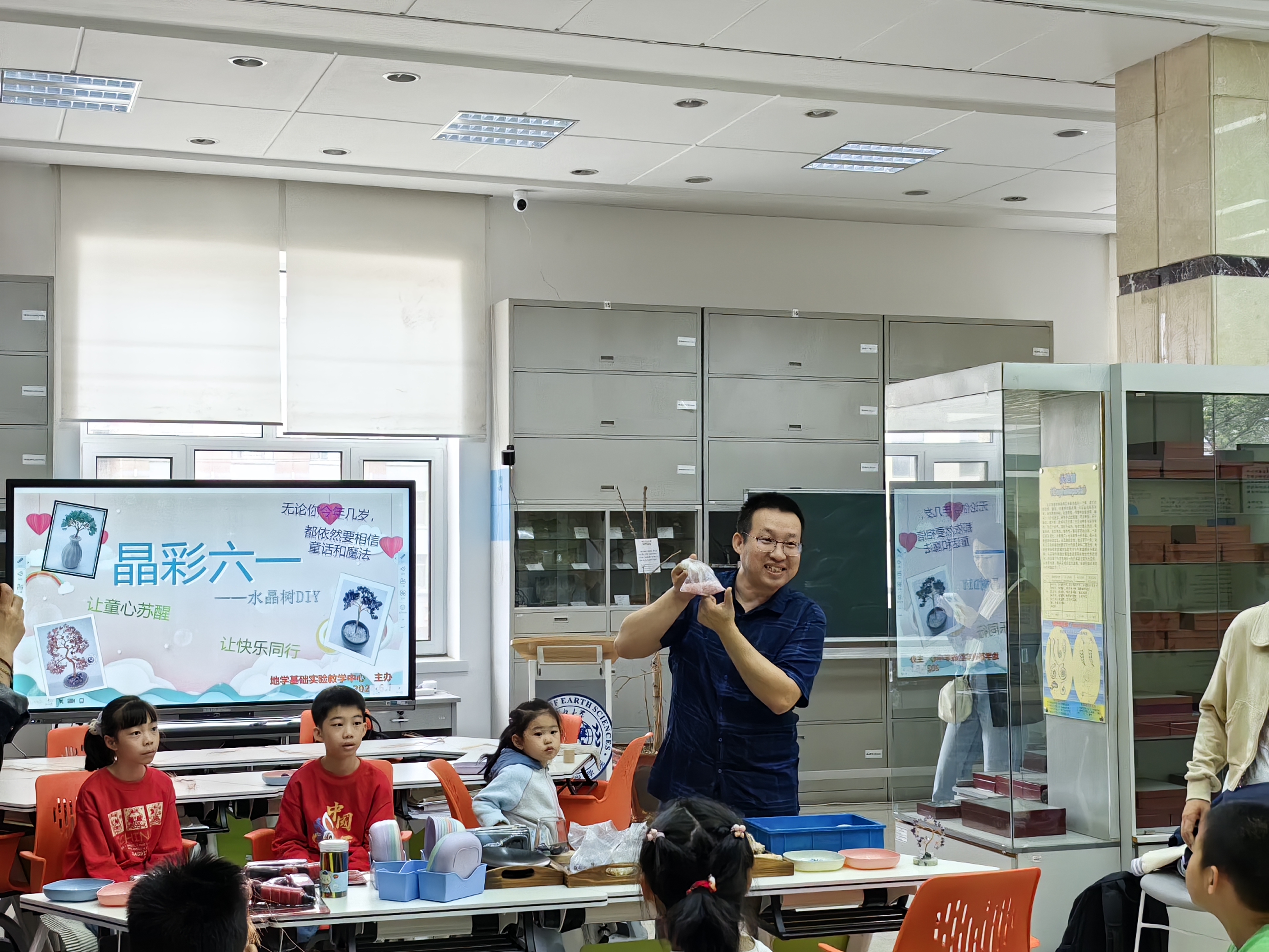 在“六一”国际儿童节到来之际,为进一步推广地质文化知识,推动地质与文创、研学活动的深度融合,激发学生创新实践的兴趣与积极性,培养创新创业实践能力,实验教学中心由“盘古开天”学生创业训练团队面向全校开展“聚石成梦·晶彩六一|水晶树DIY奇幻工作坊”活动;由实验技术人员面向学院教工及子弟开展“晶彩六一*水晶树DIY”亲子体验活动。