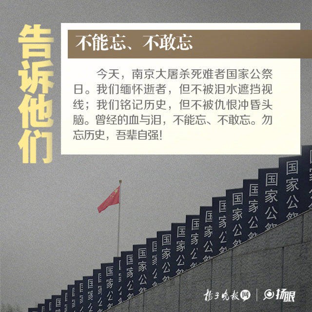 今天,我们在泪水中将过去重新提起,以国家之名,祭民族之魂。不为宣扬延续仇恨,而是要以史为鉴。唤起每一个善良的人,对和平的向往和坚守,只是希望,时间没有让人遗忘这段血与泪相和的历史,让铭记的人更多几分惦念,让淡忘的人重拾对历史的敬畏。