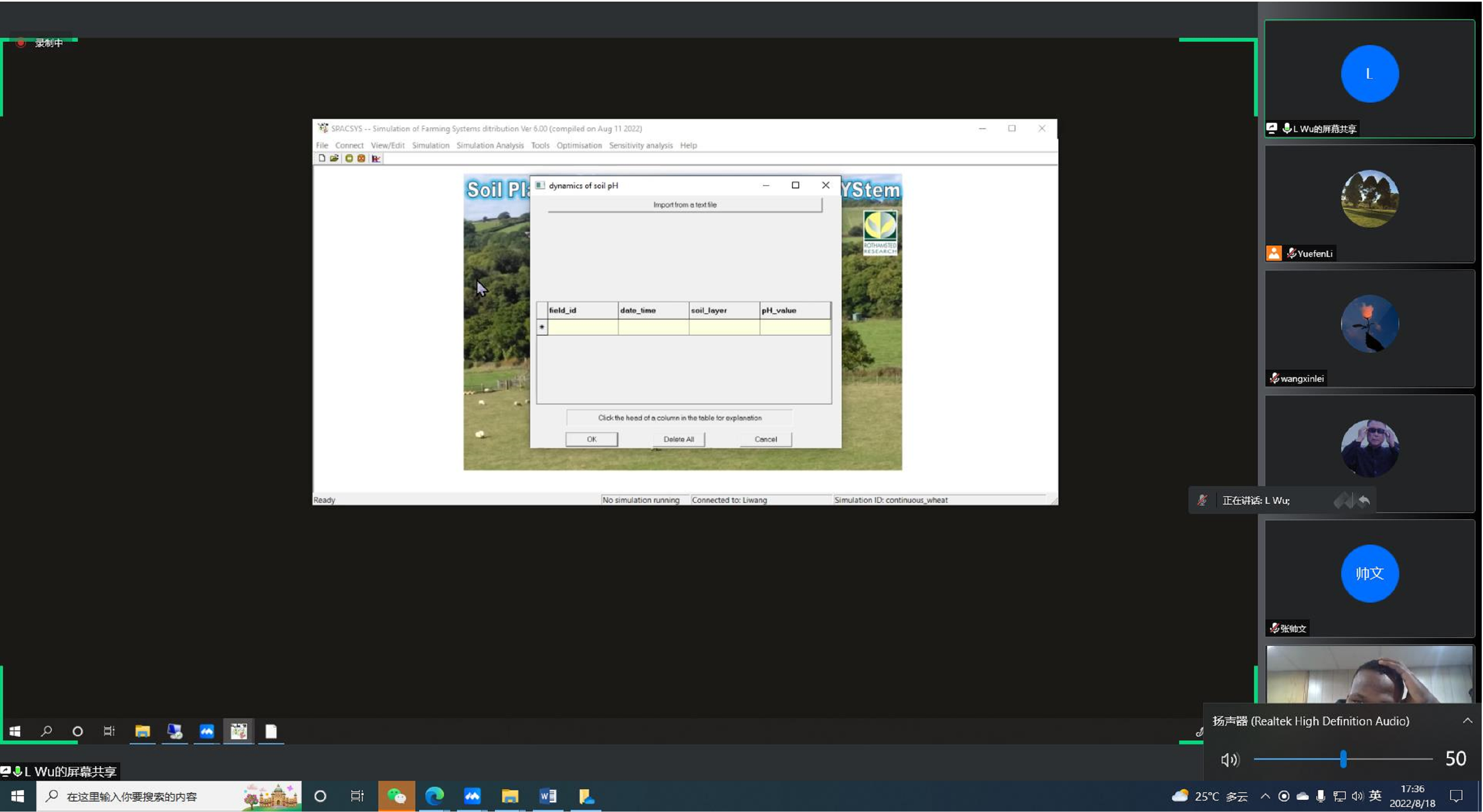 在本次暑期课程的十次课程正值英国罕见的高温天气,吴连海研究员不仅克服了难耐的酷暑,也克服了英国与中国的时间差距,清晨便为学院的老师和学生们讲授精心准备的课程,详细介绍了农业土地可持续利用的基础知识和前沿进展,并且展示了SPSCSYS的使用步骤。师生们充分利用假期时间参与学习,每天及时上线听课并积极参与讨论。课程的实施充分达到了预期效果,师生们不仅学到了前沿的专业知识,也拓展了自身的视野,培养了自身的实践应用能力,树立未来科研及职业发展的新目标。